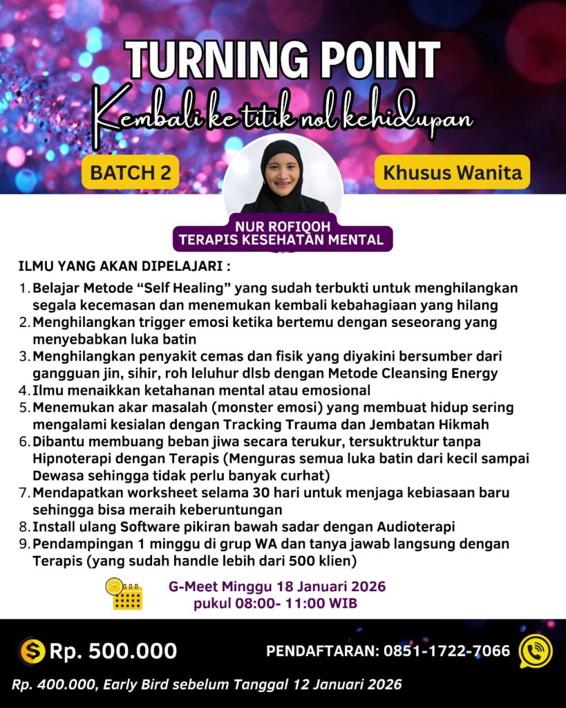 “Saya akan berikan ilmu Self Healing yang mudah dan simple , sehingga setiap hari bisa terbebas dari emosi negatif dan banyak keberuntungan datang dalam kehidupan, Ilmu ini berdasarkan pengalaman Terapis yang sudah bertahun-tahun ikut BERBAGAI kelas Self Healing dan Terapi ke berbagai tempat sebelum menjadi PRAKTISI”